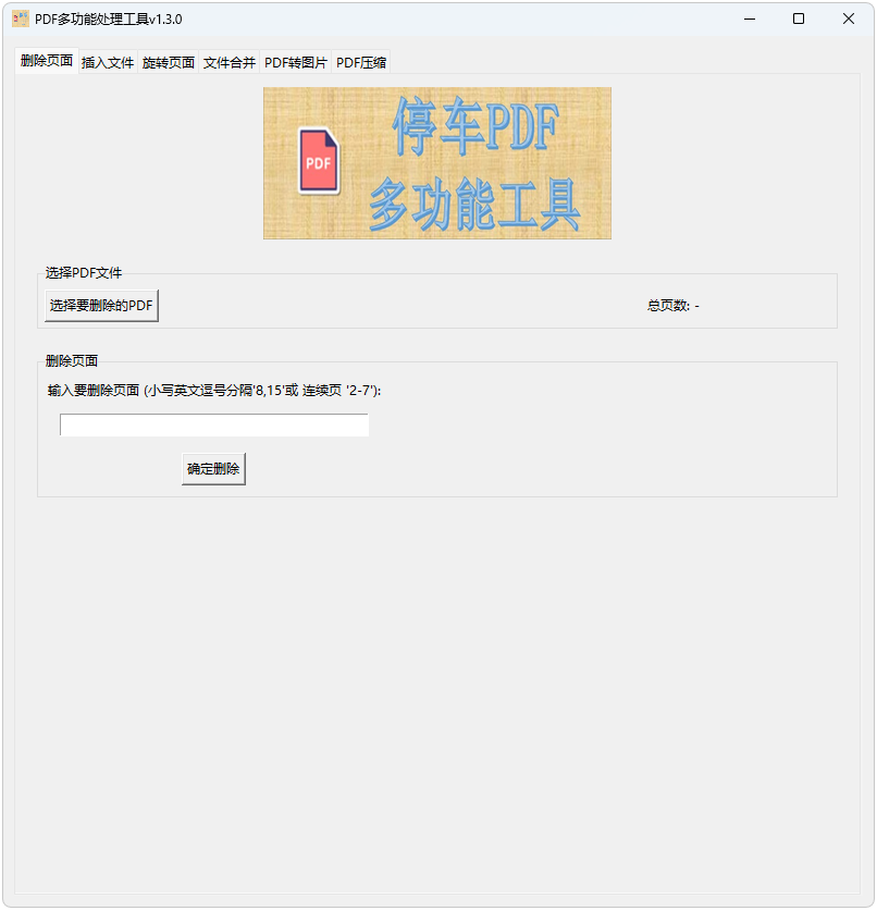 第二款是PDF多功能处理工具,这款软件完全免费,虽然功能比上面那款少一些,但依然很实用:支持删除页面、插入文件、旋转页面、文件合并、PDF转图片以及PDF压缩等6项功能。它同样是绿色版,双击即可打开。